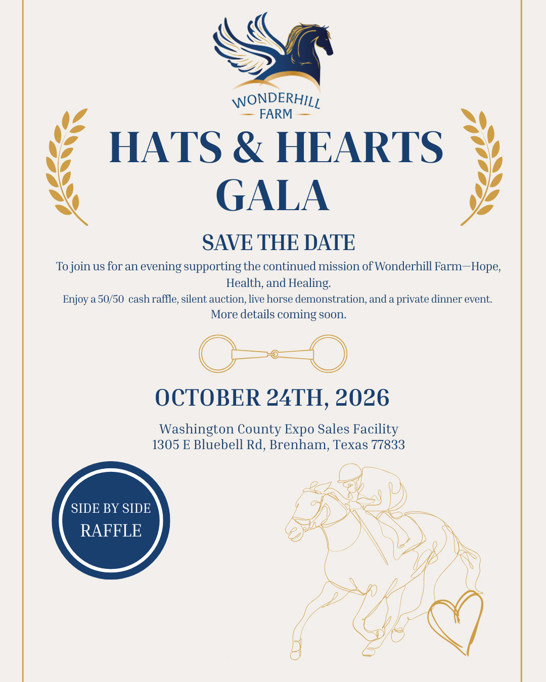 Join us at the starting gate for an unforgettable evening in support of the continued mission of Wonderhill Farm—bringing Hope, Health, and Healing to those we serve. Enjoy the thrill of a 50/50 raffle, silent auction, live horse demonstration, and a private dinner event. Don your Derby best and get ready for a night of fun, community, and friendly competition.